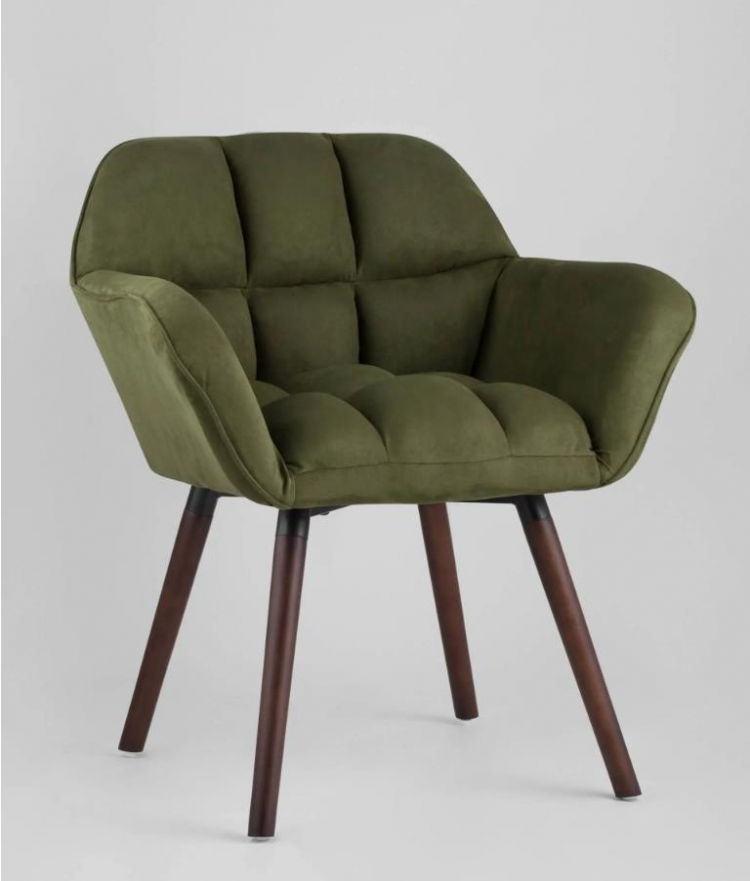 Оригинальное мягкое дизайнерское кресло Брайан в цвете хаки с удобными подлокотниками. Ножки выполнены из массива бука. В качестве обивки используется износостойкая прочная замша, которая не истирается и не линяет со временем. Кресло отличает толстая спинка и сиденье, украшенные красивой строчкой, которая добавляет креслу интересной фактуры. Каркас металлический, выдерживает нагрузку до 120 кг. Высота подлокотников от пола составляет 62 см.