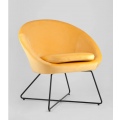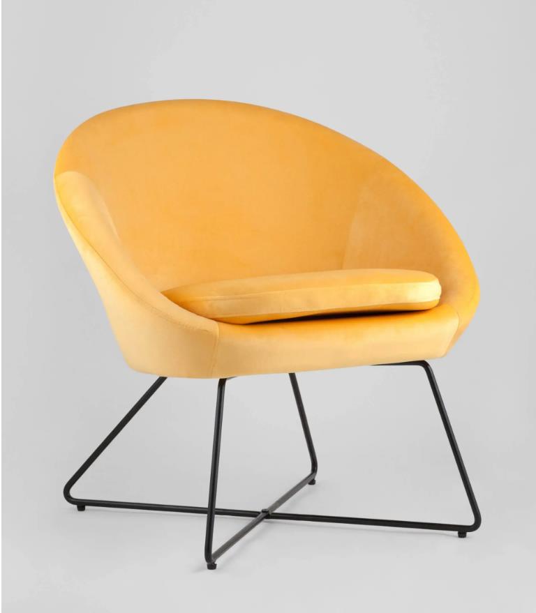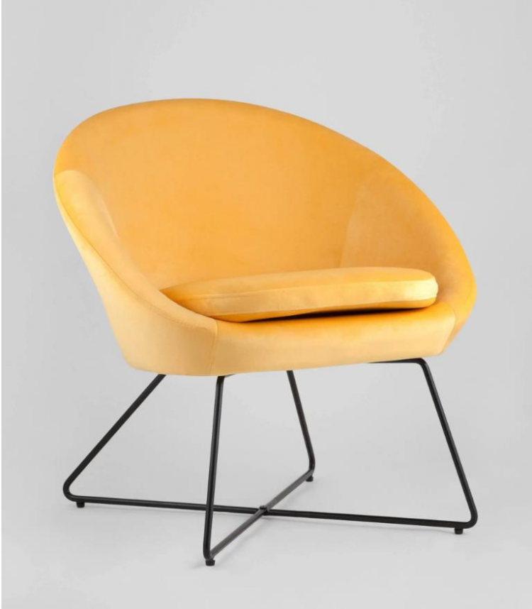 Широкая спинка плавно переходит в удобные подлокотники. Перекрещенные ножки изготовлены из металла и добавляют креслу оригинальности. Для дополнительного комфорта в кресле есть мягкое плотное сиденье. В качестве обивки используется велюр, приятный на ощупь. Металлический каркас добавляет устойчивости и выдерживает нагрузку до 120 кг.