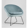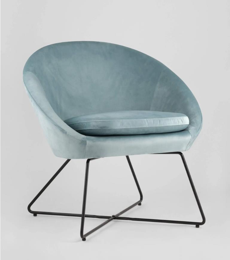 Широкая спинка плавно переходит в удобные подлокотники. Перекрещенные ножки изготовлены из металла и добавляют креслу оригинальности. Для дополнительного комфорта в кресле есть мягкое плотное сиденье. В качестве обивки используется велюр, приятный на ощупь. Металлический каркас добавляет устойчивости и выдерживает нагрузку до 120 кг.