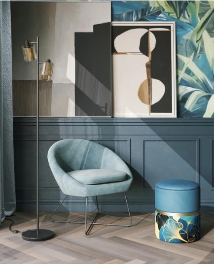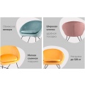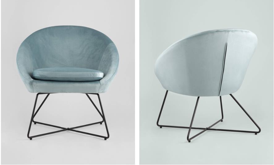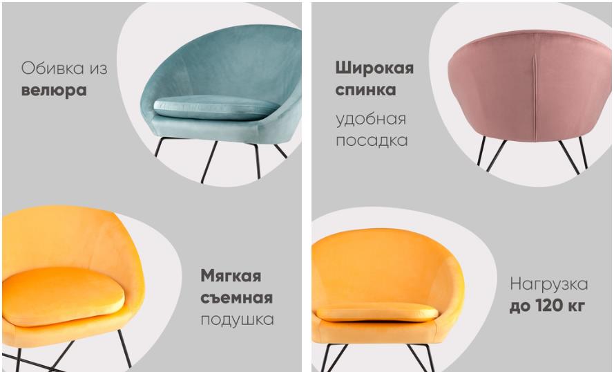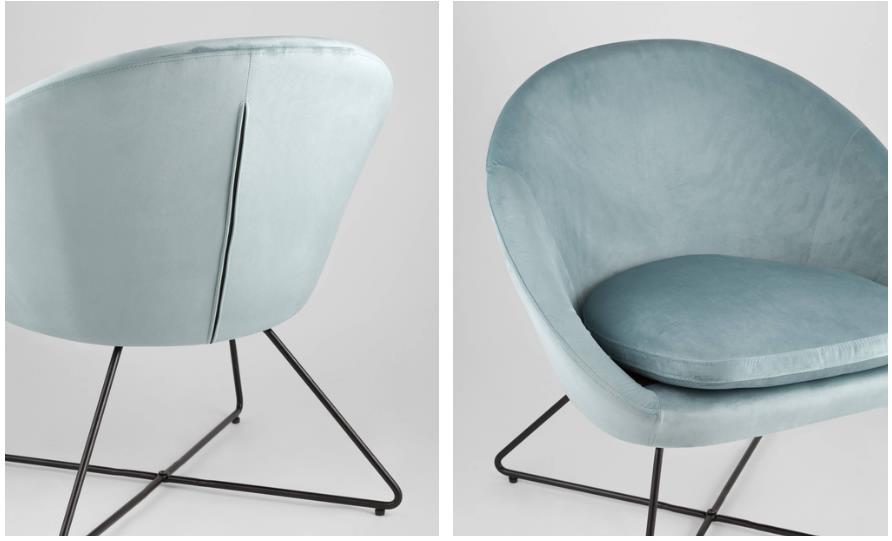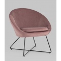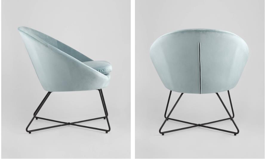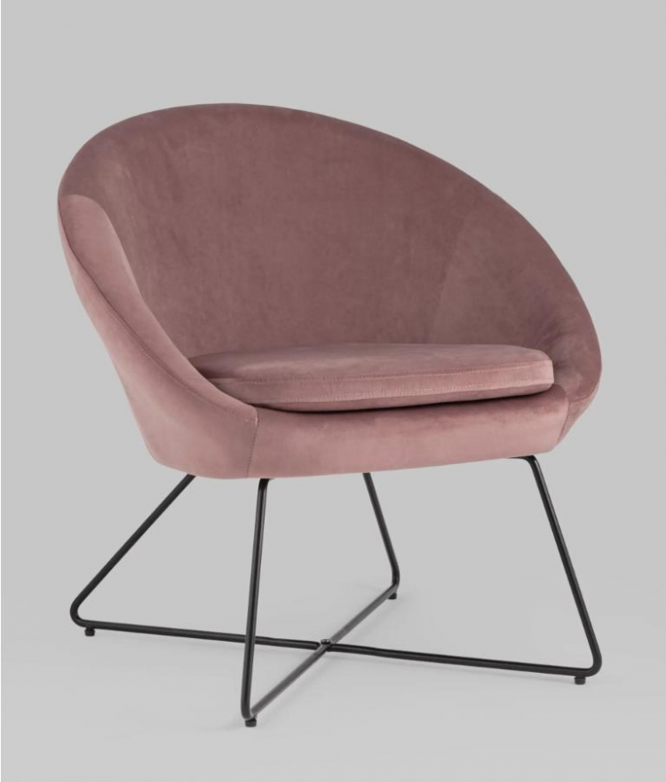 Широкая спинка плавно переходит в удобные подлокотники. Перекрещенные ножки изготовлены из металла и добавляют креслу оригинальности. Для дополнительного комфорта в кресле есть мягкое плотное сиденье. В качестве обивки используется велюр, приятный на ощупь. Металлический каркас добавляет устойчивости и выдерживает нагрузку до 120 кг.