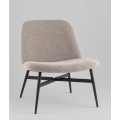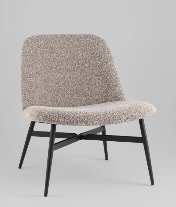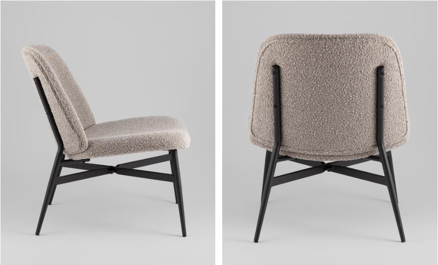 Обивка из букле, мягкая и тактильно приятная, создаёт уютную атмосферу и подчеркивает современный характер мебели. Металлический каркас и ножки в чёрном цвете обеспечивают прочность, стабильность и визуальный контраст. Спинка с наклоном и мягкое сиденье гарантируют удобство для отдыха или длительного пребывания.