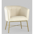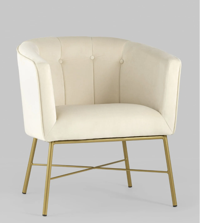 Кресло «Шале» в бежевой велюровой обивке сочетает современный дизайн и комфорт. Обивка выполнена из прочного и износостойкого велюра насыщенного бежевого оттенка, придающего изделию элегантный и стильный вид. Широкая спинка плавно переходит в подлокотники, обеспечивая удобную посадку и уют. Внутренняя сторона спинки украшена декоративными пуговицами, добавляющими изысканность. Металлические ножки с золотым гальваническим покрытием придают креслу лёгкость и современный облик, а также обеспечивают устойчивость конструкции. Компактные размеры позволяют использовать кресло в различных помещениях, таких как гостиная, спальня или кабинет, добавляя функциональность и эстетическую привлекательность.