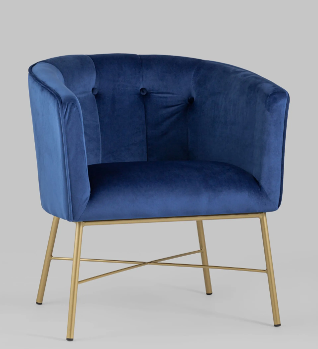 Кресло «Шале» в синей велюровой обивке сочетает современный дизайн и комфорт. Обивка выполнена из прочного и износостойкого велюра насыщенного синего оттенка, придающего изделию элегантный и стильный вид. Широкая спинка плавно переходит в подлокотники, обеспечивая удобную посадку и уют. Внутренняя сторона спинки украшена декоративными пуговицами, добавляющими изысканность. Металлические ножки с золотым гальваническим покрытием придают креслу лёгкость и современный облик, а также обеспечивают устойчивость конструкции. Компактные размеры позволяют использовать кресло в различных помещениях, таких как гостиная, спальня или кабинет, добавляя функциональность и эстетическую привлекательность.