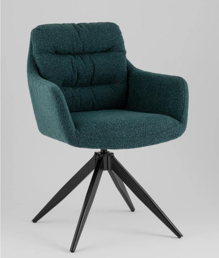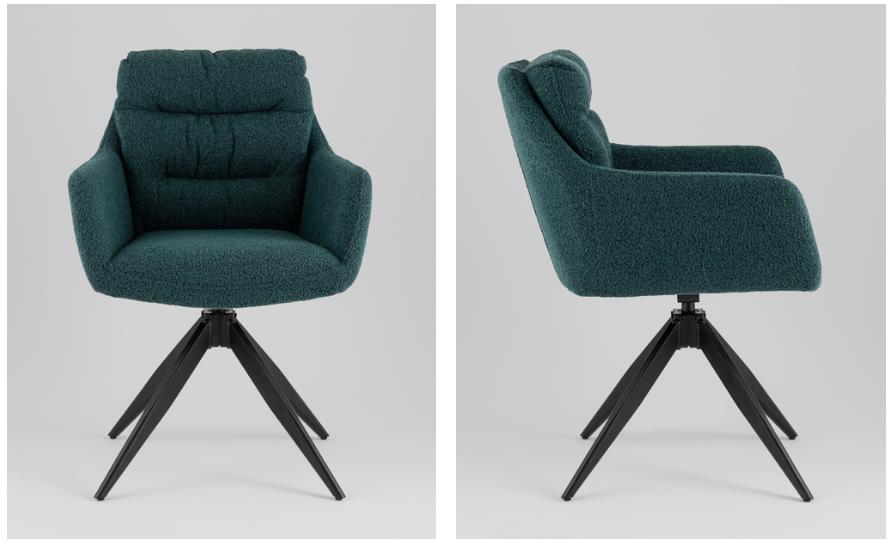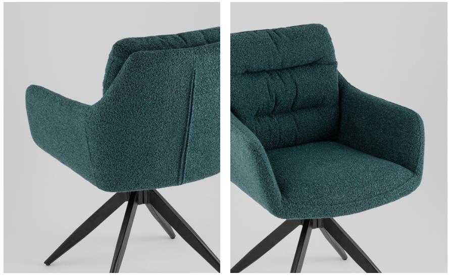 Материалы и удобство. Обивка из ткани букле добавляет текстуры и создаёт приятные тактильные ощущения, делая стул особенно комфортным для сидения. Мягкое сиденье обеспечивает дополнительное удобство, а подлокотники создают ощущение поддержки и уюта, идеально подходя для длительного пребывания за столом.