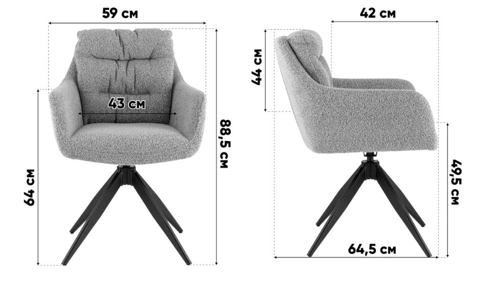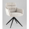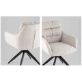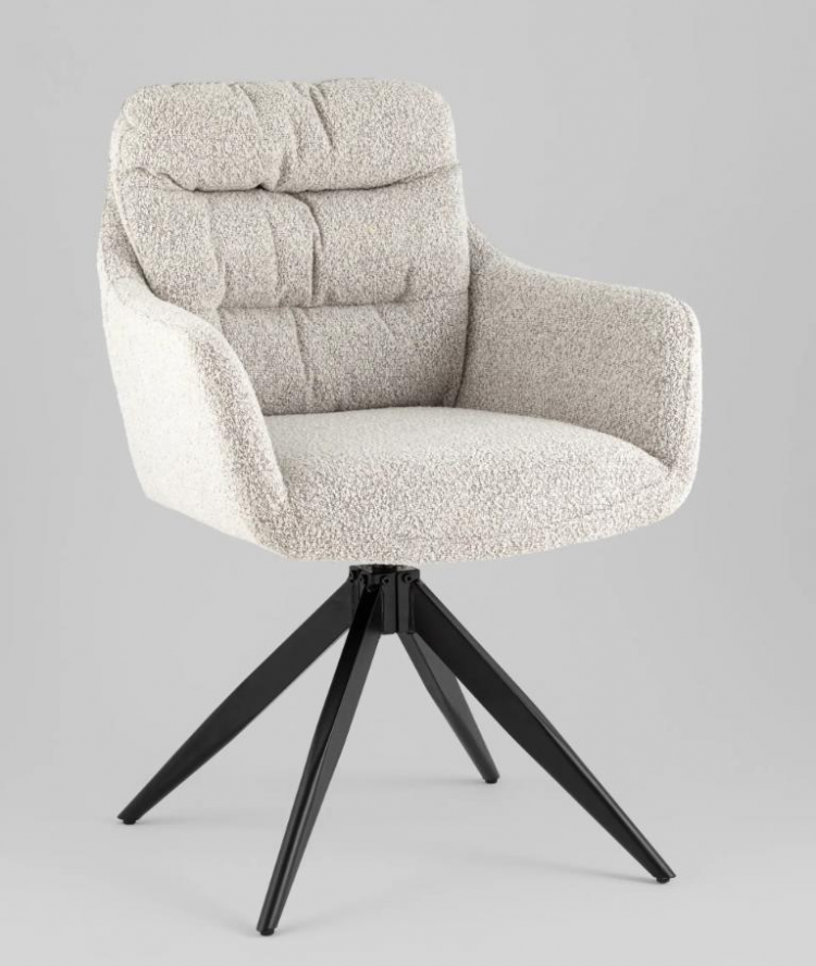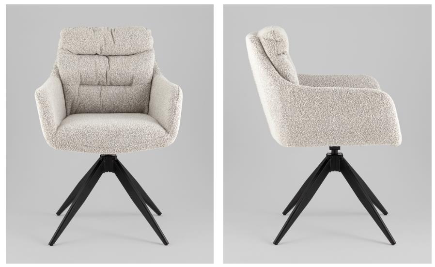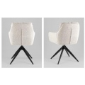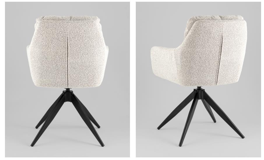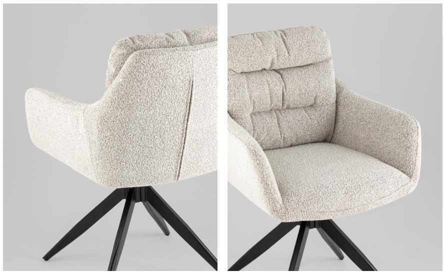 Материалы и удобство. Обивка из ткани букле добавляет текстуры и создаёт приятные тактильные ощущения, делая стул особенно комфортным для сидения. Мягкое сиденье обеспечивает дополнительное удобство, а подлокотники создают ощущение поддержки и уюта, идеально подходя для длительного пребывания за столом.