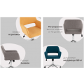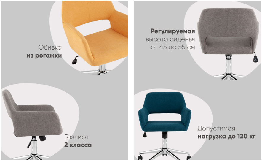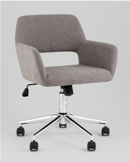Материалы и цвета. Обивка выполнена из прочной и приятной на ощупь рогожки, которая придаёт стулу современный и уютный вид. Металлическая крестовина с хромированным покрытием обеспечивает долговечность и устойчивость. Нейлоновые ролики гарантируют плавное перемещение по различным покрытиям пола.